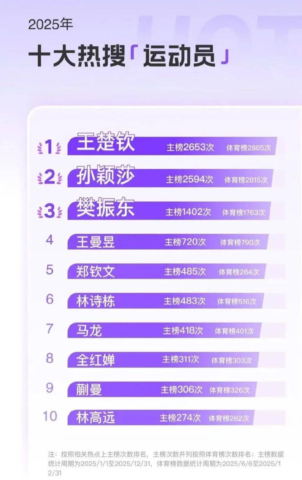 半岛,半岛体育,半岛体育app,半岛官网,半岛电竞,半岛真人,半岛棋牌,半岛体育官网注册,半岛体育官方app下载,半岛体育官方注册网址,半岛体育平台官网注册链接,半岛体育app下载,半岛体育怎么样,半岛体育官网,半岛体育登录入口,半岛体育官方网站,半岛最新入口,半岛下注,半岛投注首先,让我们聚焦于《2025十大热搜运动员》。毫无疑问,这份榜单几乎成为了乒乓球运动员的天下。王楚钦以全年2653次的热搜傲视群雄,稳居榜首。紧随其后的是孙颖莎,全年热搜次数为2594次,与王楚钦的差距微乎其微。然而,位列第三的樊振东则与前两位拉开了明显的差距,全年热搜次数为1402次。除了这三位领军人物,王曼昱、林诗栋、马龙、蒯曼以及林高远等一众乒乓球名将也榜上有名,充分彰显了乒乓球运动在中国的巨大影响力。这份榜单中,仅有网球新星郑钦文和跳水名将全红婵为其他项目的运动员保留了一席之地。