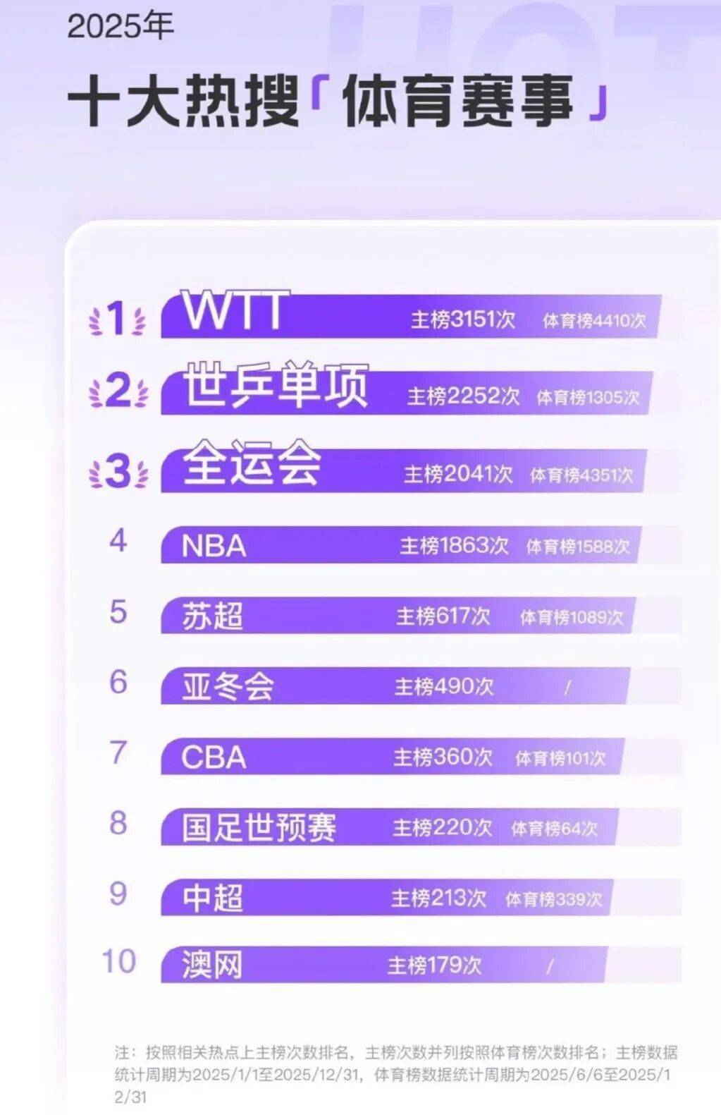 最后,我们来看《2025十大热搜体育项目》。乒乓球以惊人的10871次热搜遥遥领先,稳居第一。相比之下,排名第二的篮球只有2966次热搜,足球则为2573次。至于后面的项目,热度更是大幅下降,排名垫底的赛车仅有220次热搜。虽然在全球范围内,足球和篮球拥有着无可比拟的广泛受众,但在中国,乒乓球无疑是当之无愧的第一大运动。这不仅与乒乓球作为中国的“国球”的特殊地位有关,也得益于中国乒乓球队在世界乒坛的绝对统治地位。其中,一些明星运动员更是成为了中国乃至世界体坛的超级偶像,拥有着庞大的人气。